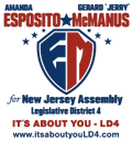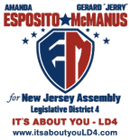 In the 2023 general election, Esposito ran for the Assembly in LD4 and narrowly lost, finishing just 3 percentage points behind the winning candidates. Undeterred, she announced her candidacy for the 2025 election, partnering with Gerard “Jerry” McManus under the campaign slogan “It’s About You LD4.” Their platform emphasizes a bottom-up approach, focusing on amplifying the voices of LD4 residents and businesses in Trenton.