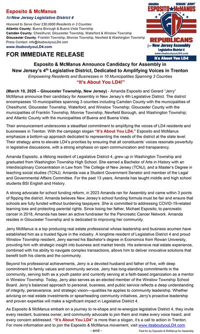 Esposito & McManus are committed to re-energizing LD4, advocating for real solutions, and ensuring that every resident and business owner is heard. “It’s About You, LD4” is more than a slogan—it’s a call to action in Trenton. For more information, visit www.ItsAboutYouLD4.com.