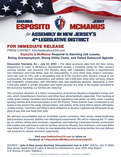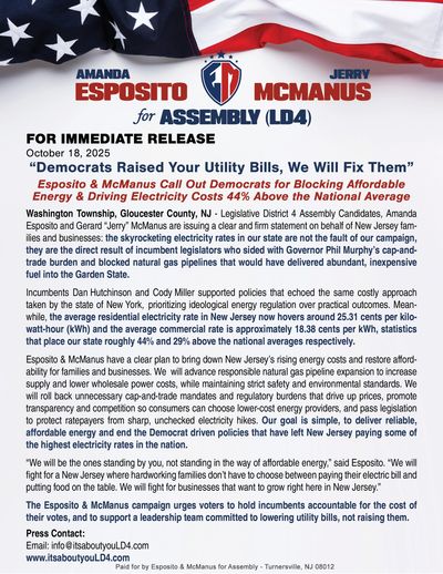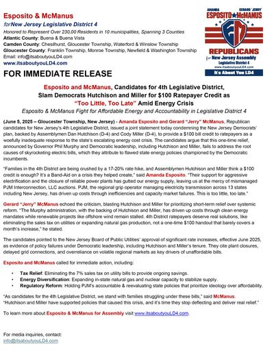 (June 5, 2025 – Gloucester Township, New Jersey) - Amanda Esposito and Gerard “Jerry” McManus,Republican candidates for New Jersey’s 4th Legislative District, issued a joint statement today condemning the New Jersey Democrats’ plan, backed by Assemblymen Dan Hutchison (D-4) and Cody Miller (D-4), to provide a $100 bill credit to ratepayers as a woefully inadequate response to the state’s escalating energy cost crisis. The candidates argue that this one-time relief, announced by Governor Phil Murphy and Democratic leadership, including Hutchison and Miller, fails to address the root causes of skyrocketing electric bills, which they attribute to flawed state energy policies championed by the Democratic incumbents.