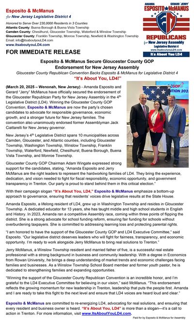 “I am honored to have the support of the Gloucester County GOP and LD4 Executive Committee,” said Esposito. “Our legislative district deserves leaders who will fight for fairness, transparency, and economic opportunity. I’m ready to work alongside Jerry McManus to bring real solutions to Trenton.”