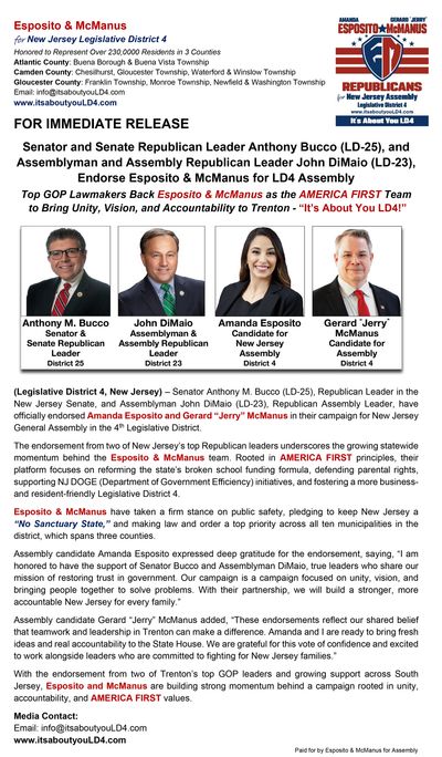 Top GOP Lawmakers Back Esposito & McManus as the AMERICA FIRST Team to Bring Unity, Vision, and Accountability to Trenton - “It’s About You LD4!”