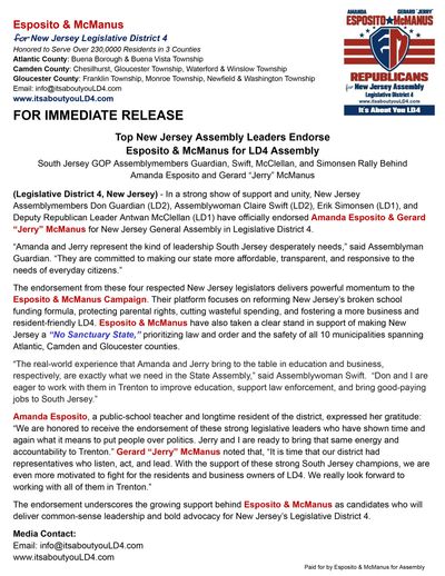 (Legislative District 4, New Jersey) - In a strong show of support and unity, New Jersey Assemblymembers Don Guardian (LD2), Assemblywoman Claire Swift (LD2), Erik Simonsen (LD1), and Deputy Republican Leader Antwan McClellan (LD1), and have officially endorsed Amanda Esposito & Gerard “Jerry” McManus for New Jersey General Assembly in Legislative District 4.